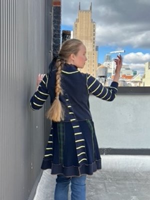 I drape pieces on a mannequin, then begin a meticulous cutting process, creating strips for the skirt, connecting contrasting arms. I sew the garment together with a sewing machine and serger, create a zipped or button closure, then finish off the design with surface embroidery and final hand sewing. Each garment takes 20-35 hours to make.